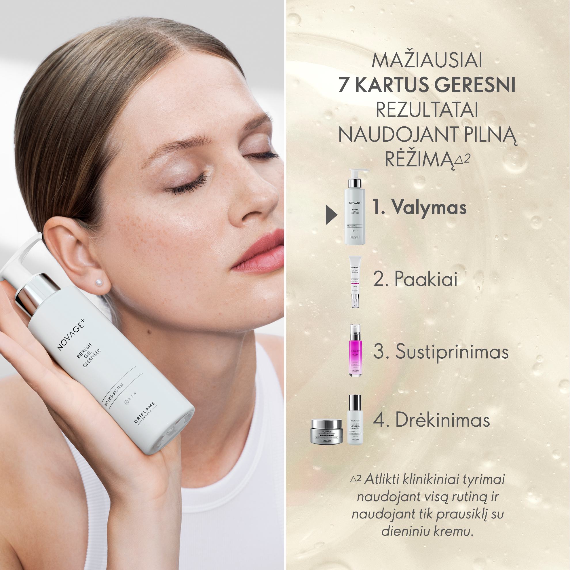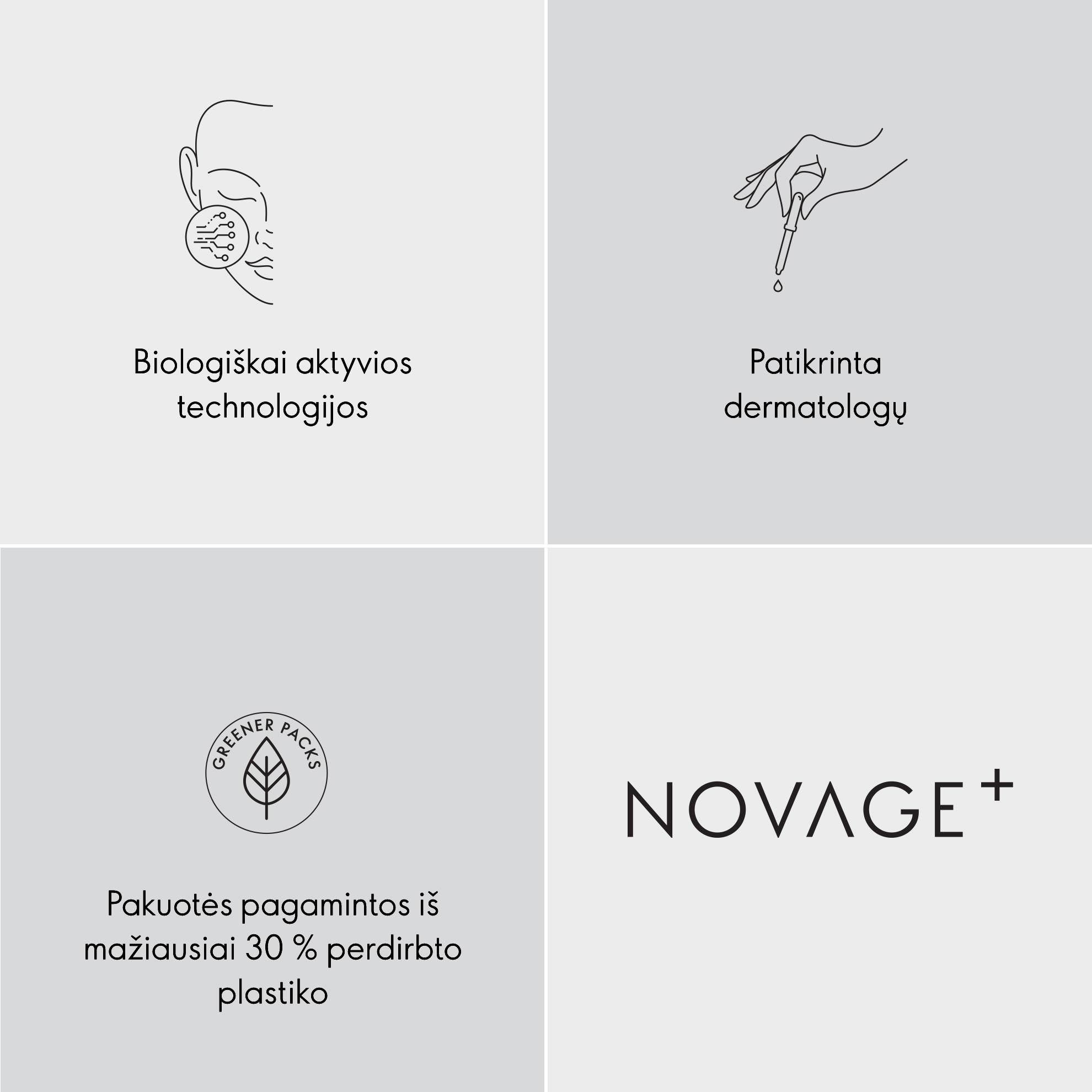 „Novage+“ pasižymi kosmetikos veiksmingumu ir kartu yra švelni odai ir gamtai dėl mūsų biologiškai aktyvių technologijų, kurios puikiai sinchronizuojasi su jūsų odos biologinėmis funkcijomis - ir viena su kita - galingai, švelniai ir tiksliai.